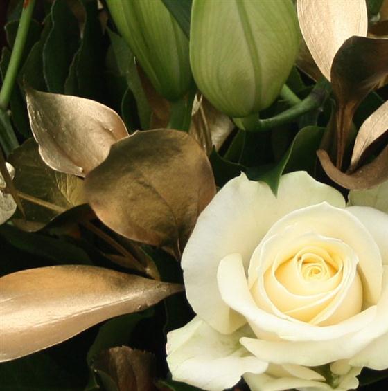 A highly scented cream, gold and dark red festive hand-tied with white roses, oriental lilies and gilt foliage.