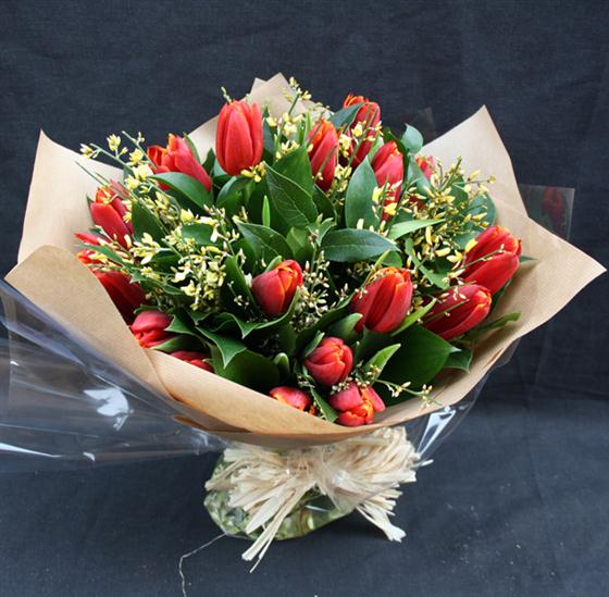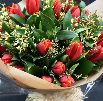 Elegant red tulip hand-tied bouquet featuring fresh seasonal foliage and delicate filler flowers, beautifully wrapped for a stylish gift. Perfect for birthdays, anniversaries, or simply brightening someone’s day.