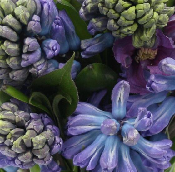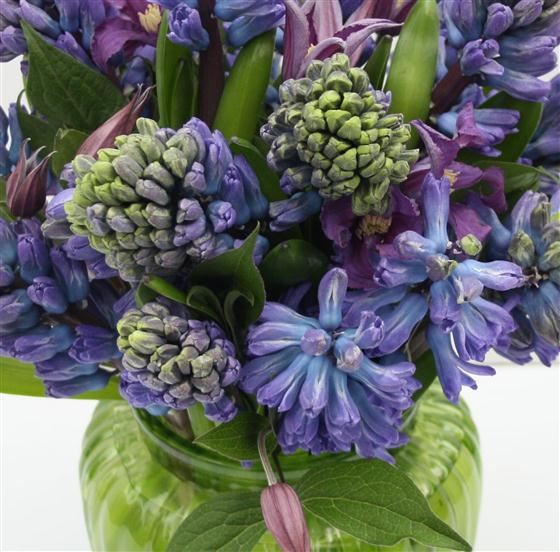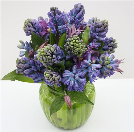 A sweet vase that includes an abundance of blue hyacinths and blue clematis flower.